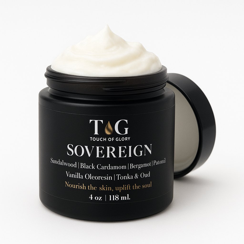 SOVEREIGN is crafted with a purposeful blend of plant-based butters and nutrient-rich oils that deeply condition and protect the skin. Shea butter and mango butter deliver intense moisture and a smooth, velvety finish, while grapeseed, jojoba, and sweet almond oil provide lightweight hydration and support the skin’s natural barrier.